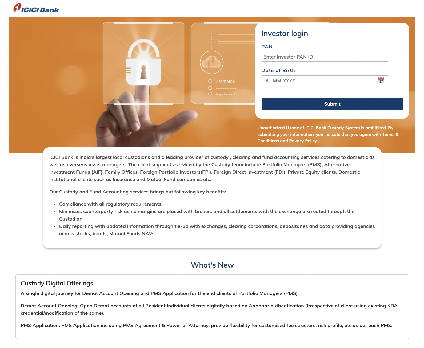 This application will acts as a platform for various Custody related digital services such as demat account opening, bank account opening, accepting service requests etc.